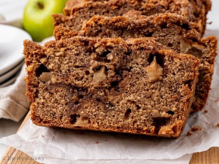 Here on The Fresh Cooky, I rigorously test my recipes so you don’t have to! I experimented with both buttermilk and regular milk, and after three rounds of testing, I found the just-right combo. The result? A soft, buttery crumb that slices beautifully, with rich apple flavor and just the right touch of cinnamon spice. It’s the Goldilocks of apple breads; not too heavy, not too light…just right.