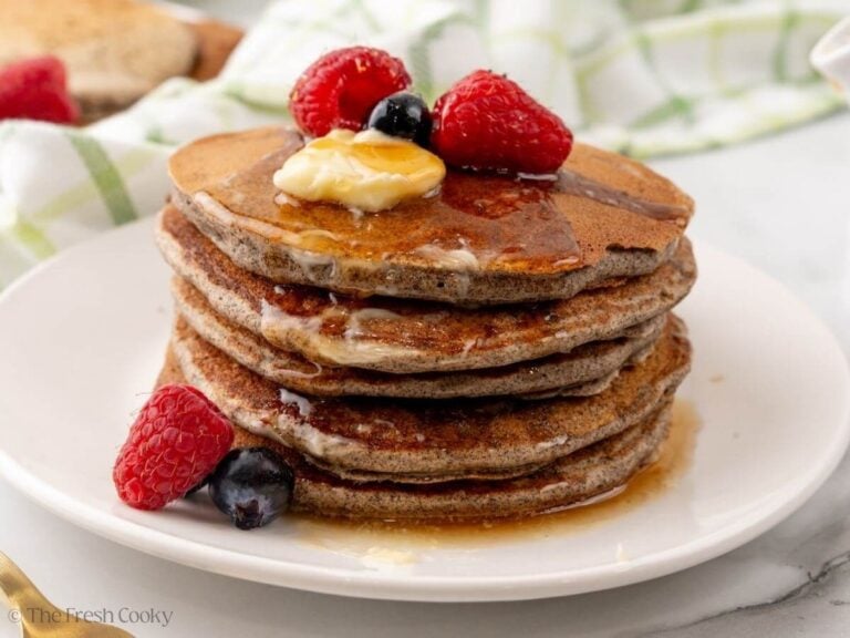 When it comes to storing leftovers (or if you’re meal prepping), first allow pancakes to cool completely. Store in an airtight container in the refrigerator for up to 4 days. Place parchment paper between layers if stacking to prevent sticking.
