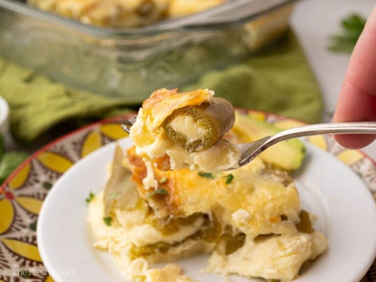 It’s a twist on the classic Mexican chile relleno recipe. A baked version with roasted green chilies, layered in cheese and baked in an egg batter until tender.