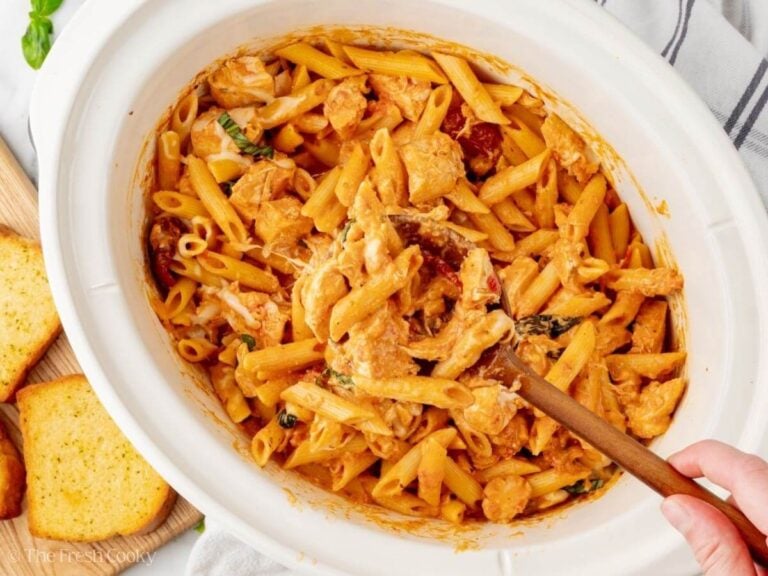 If your weeknight dinners need a reset, this Crockpot Alfredo Marinara Chicken Pasta is the answer. It’s the same easy recipe; creamy dump-and-go meal you’ve seen all over TikTok, only with real ingredients and a sauce that actually tastes homemade!
