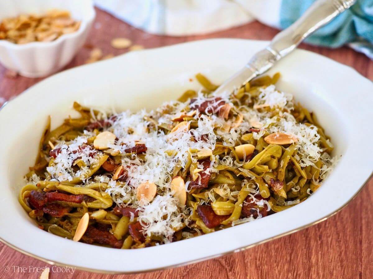 Homemade Southern-style Green Beans are a staple of holiday celebrations in my home and are so simple to make with less than 10 ingredients! They have a delicious smoky flavor, thanks to crispy bacon. I top mine with crispy fried onions and almonds as a nod to green bean casserole.