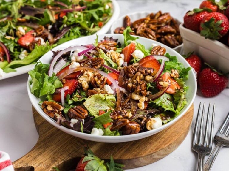 Undressed salad: Store greens, strawberries, onions, cheese, and nuts separately in airtight containers in the refrigerator for up to 2 days. I find it’s so easy to assemble a big salad or several individual salads when I prep the ingredients this way (and every bite is so fresh too!).